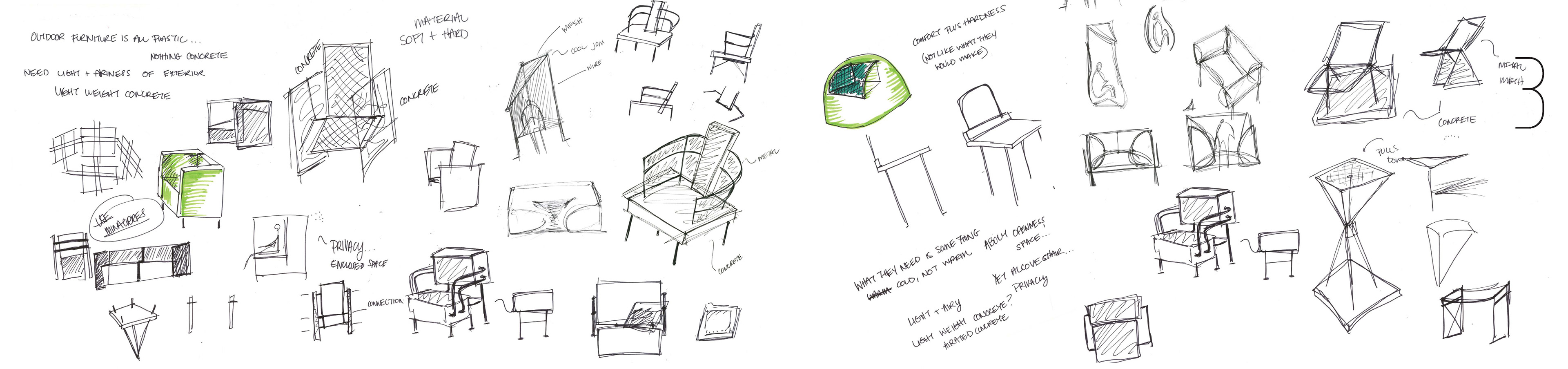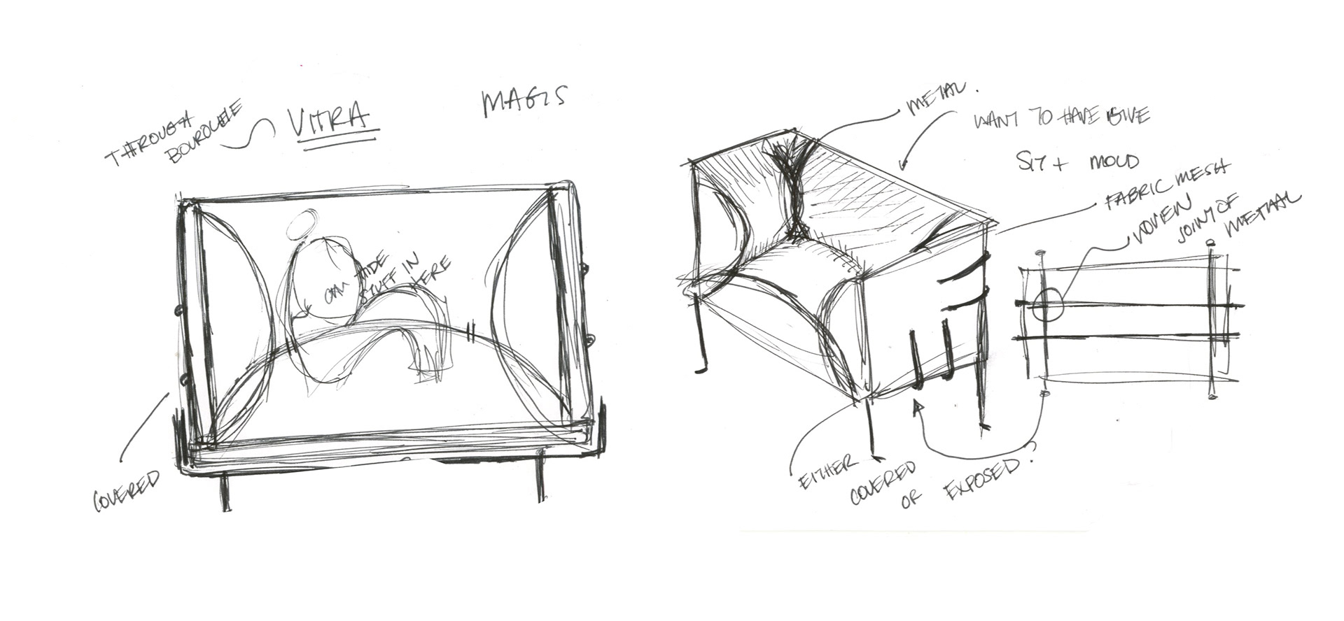 Chair De Poule a piece of furniture that fits the design aesthetic of the famous furniture company Vitra, but furthermore my inspiration came from the design collection made by the Bouroullec brothers under Vitra. Works including their Alcove Sofa, which brings privacy at a much smaller scale within the space of a sitting area, and the Slow Chair, which brings with it comfort and flexibility, fueled my drive in creating Chair De Poule.