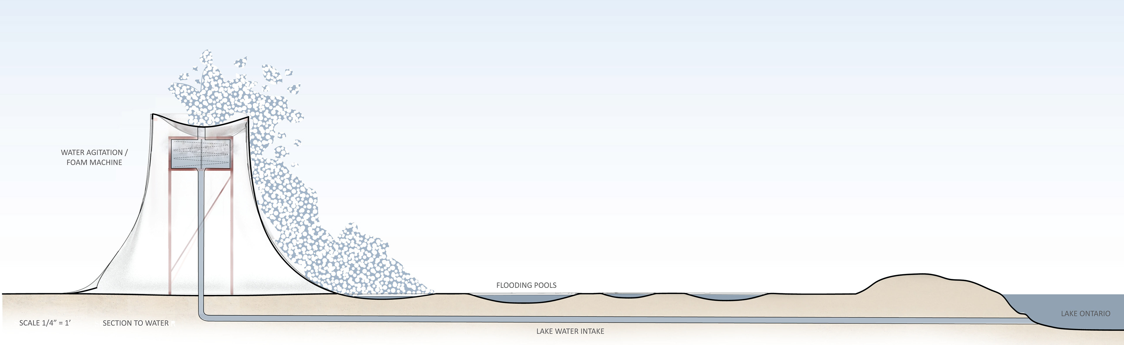 Competition entry for Winterstations in collaboration with JBA Collective.What does the word Riot meant to the city of Toronto? We saw our riot from global warming’s involvement in the way that the environment of Lake Ontario had changed, which has resulted in large scale flooding currently on the site of the installation. In response, our Foam’al Outburst explodes from the site, disrupting the flow of the sand and creating a formal expression of the rough waters disrupting the lake shoreline. In the colder months, the installation would freeze over to calm the riots of the water.
