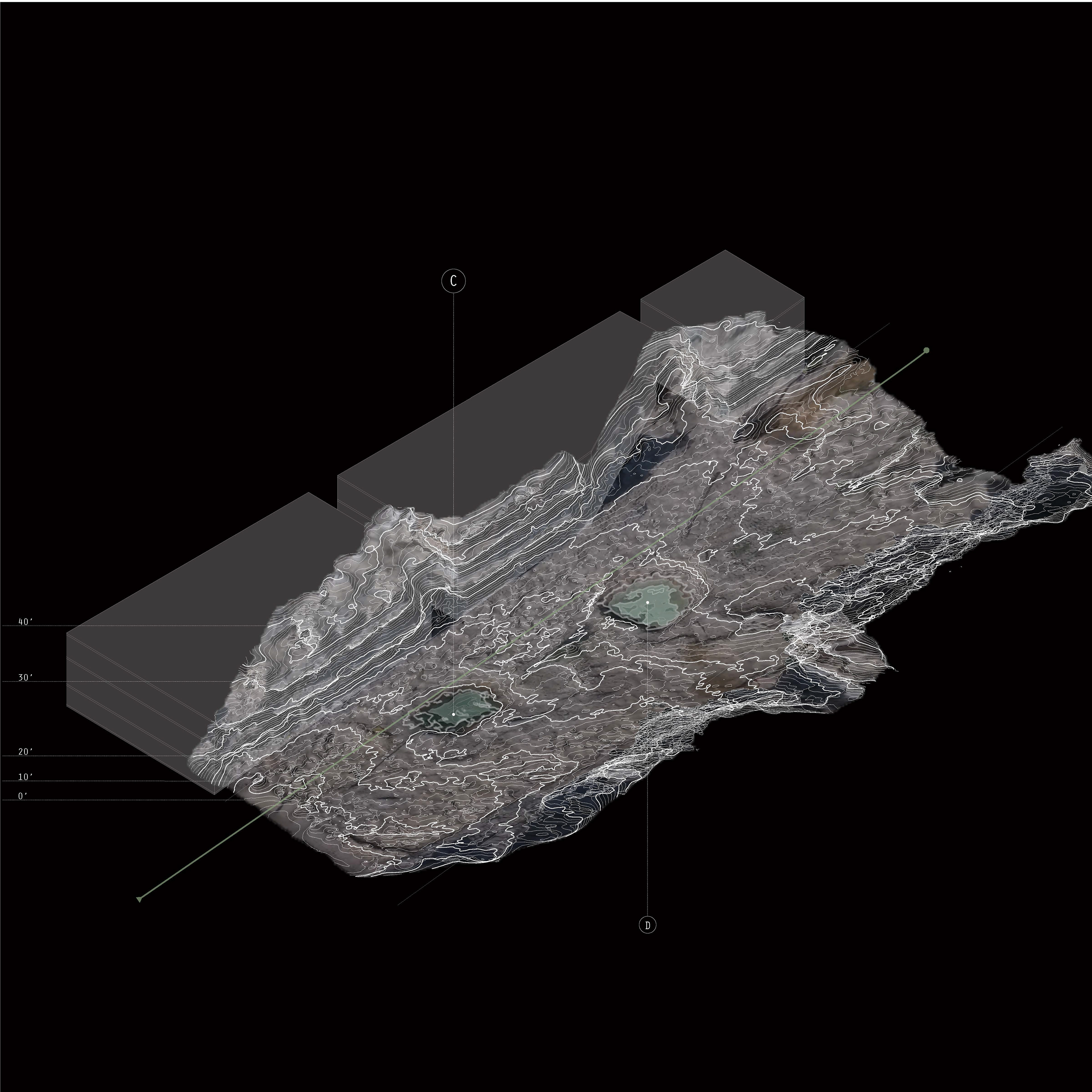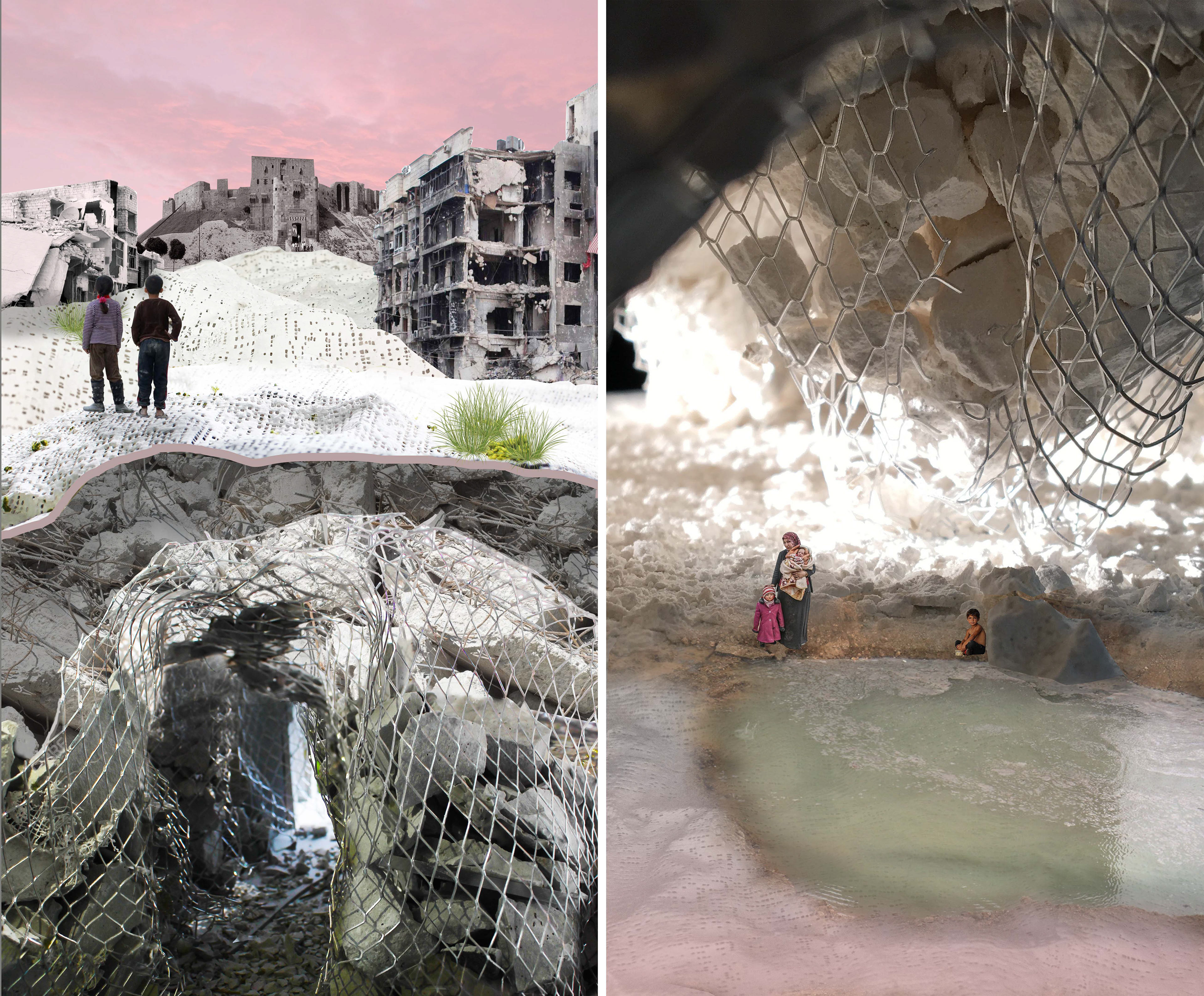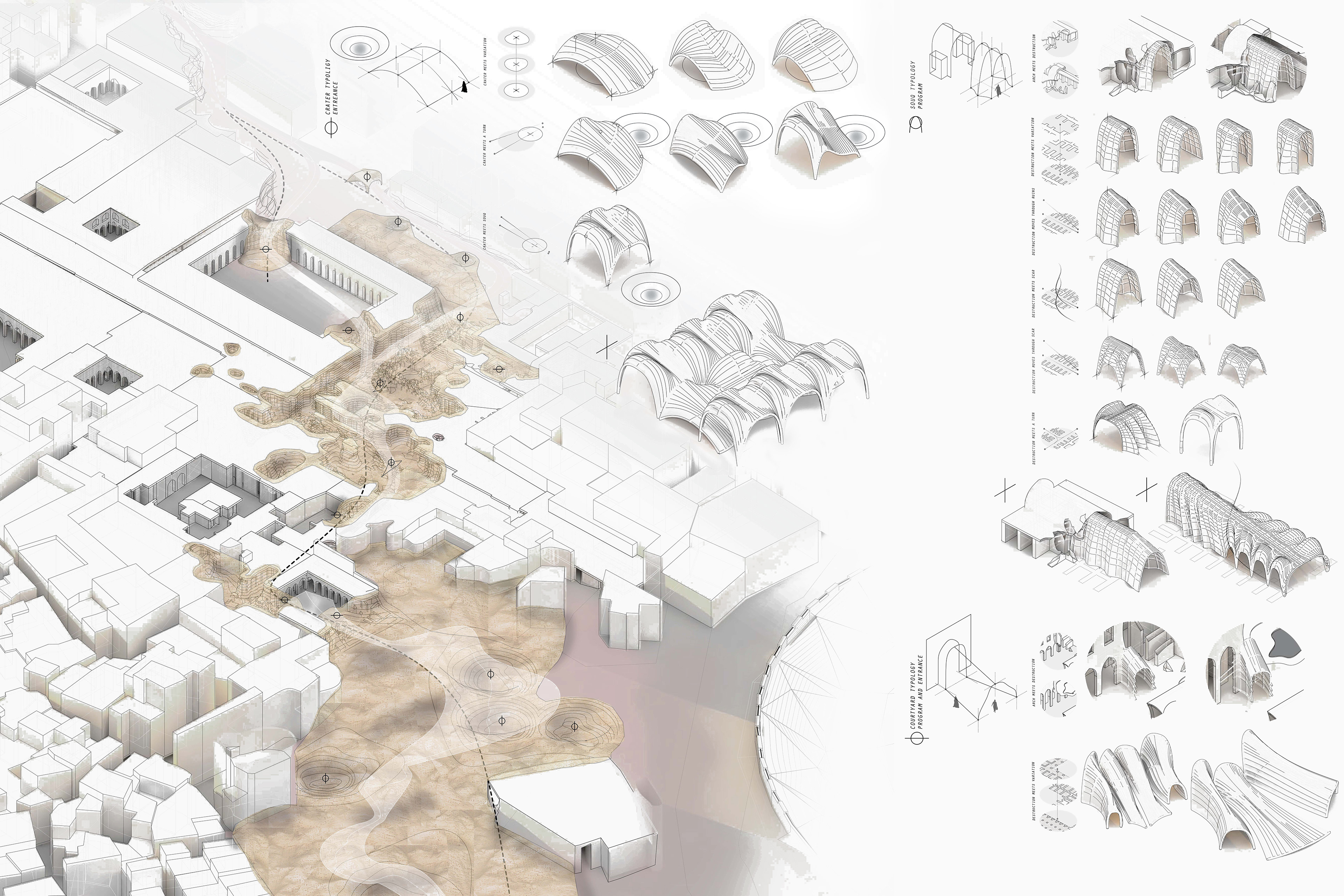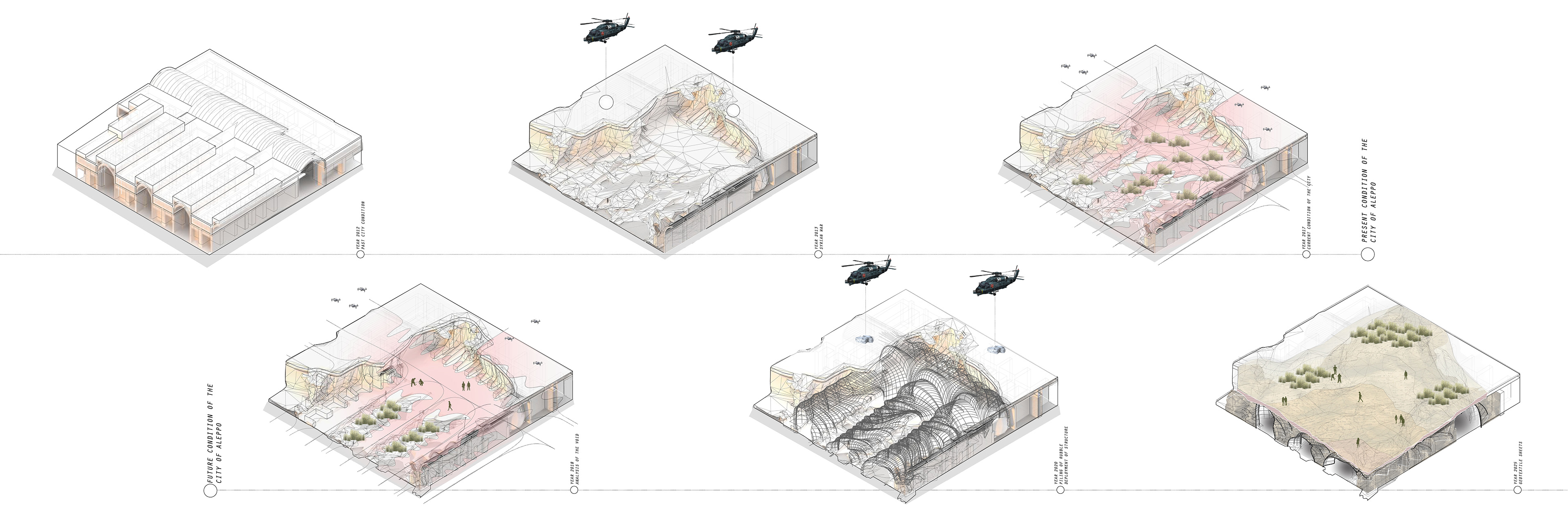 In this we find our Past Presence, the ecology of nostalgia, the existence of these moments of time in one uniform system of embedded information. Within the site of Aleppo, Syria, we saw opportunity through its destruction for a new means of reconstruction. The hybrid of architecture and landscape shrouds and mends the shattered pieces of the city by tracing its present undesign voids. This void is then amplified by the historical program of the site that was once there through a new system of archways, once that cater to past information and present destruction. In this form we see the stability and instability of memory and void itself, and allow for a competing temporality of past information.
