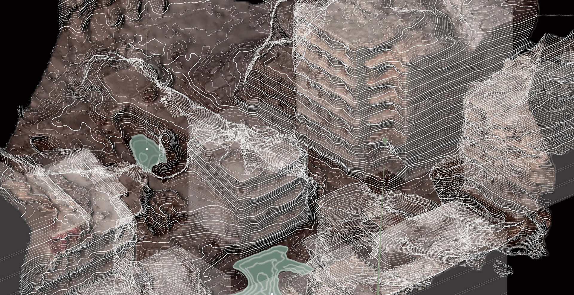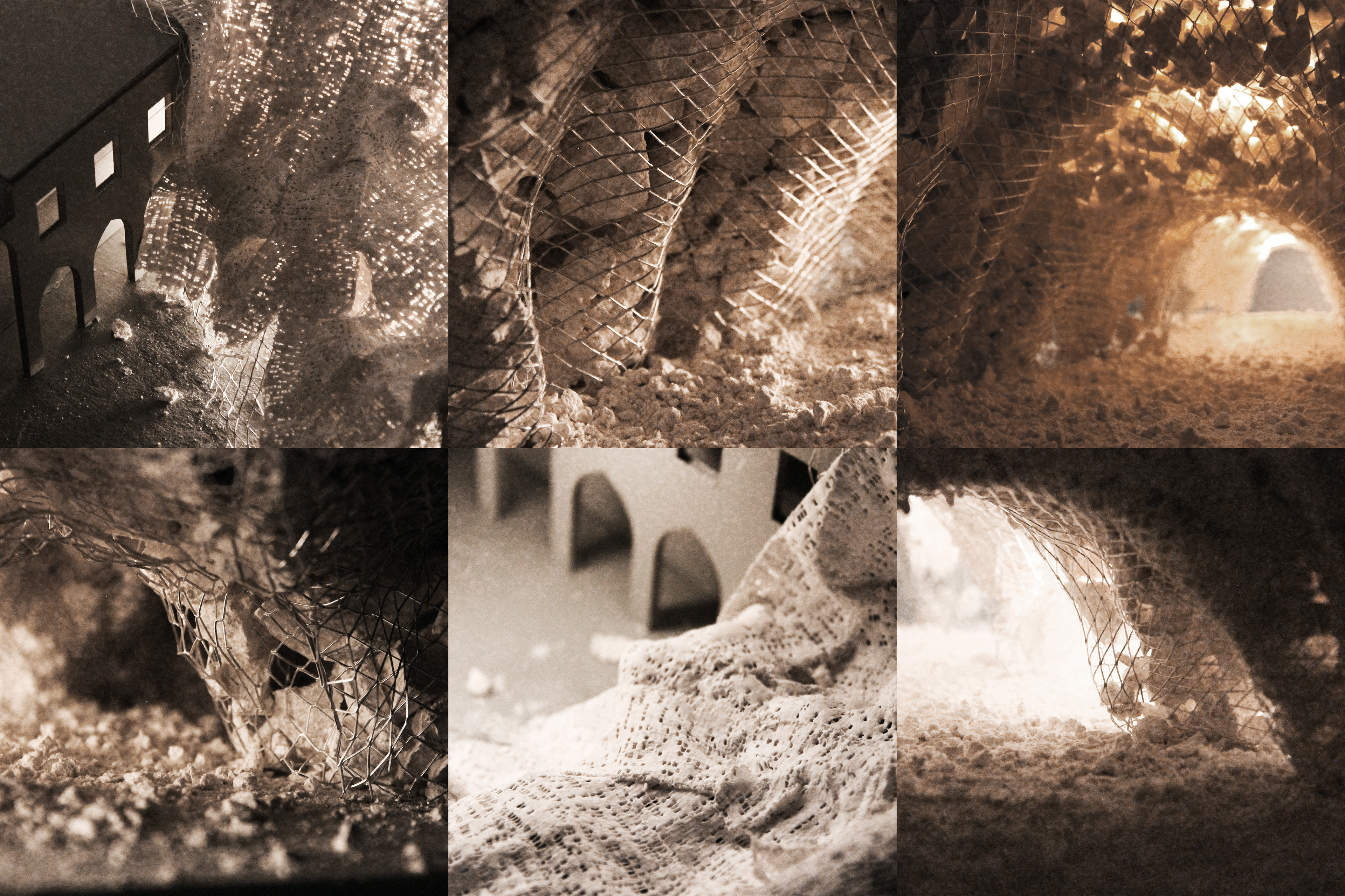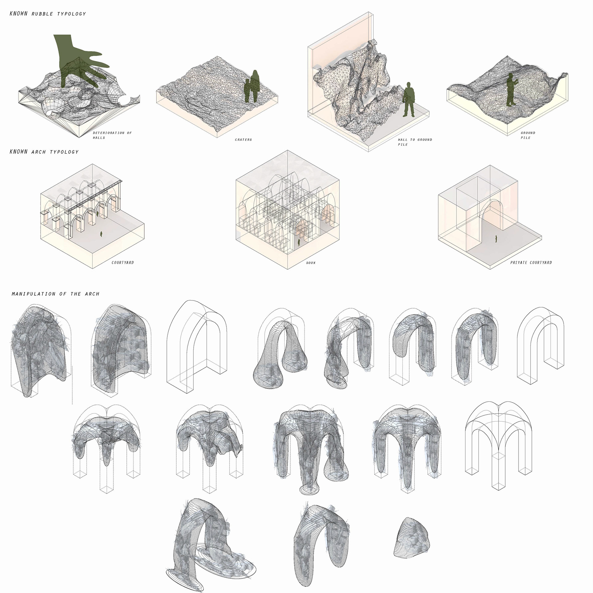 Along this lineage of time, the architectural system is implemented in the harsh reality of our world today. War and disaster take a toll on memory and its architectural instances that hold those memories in place. The arch becomes nothing more than a pile of rubble, a scar on the landscape. This once structural symbol has been stripped of its rigidity and now blankets a new, undesigned (or unplanned) void, the crater.