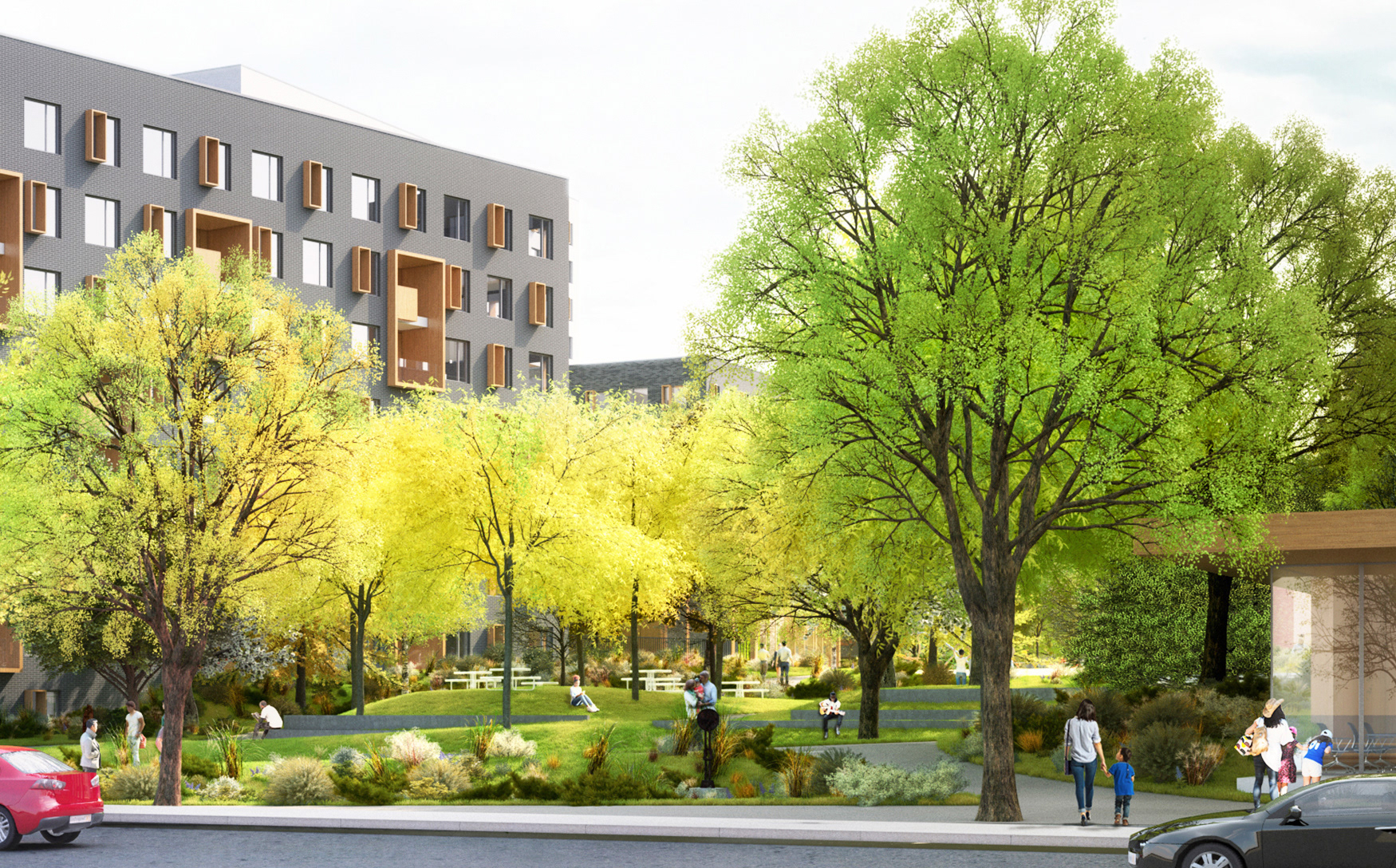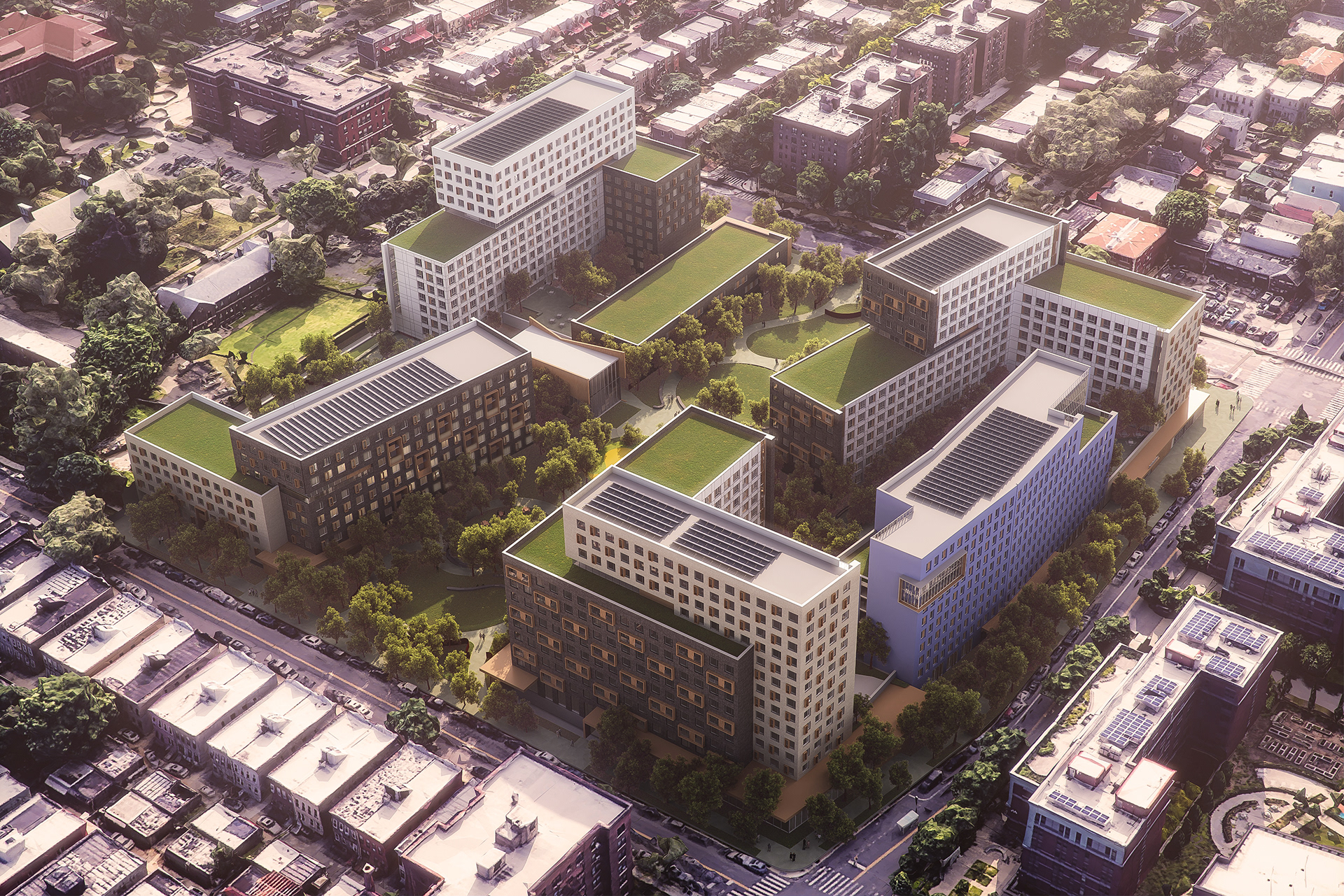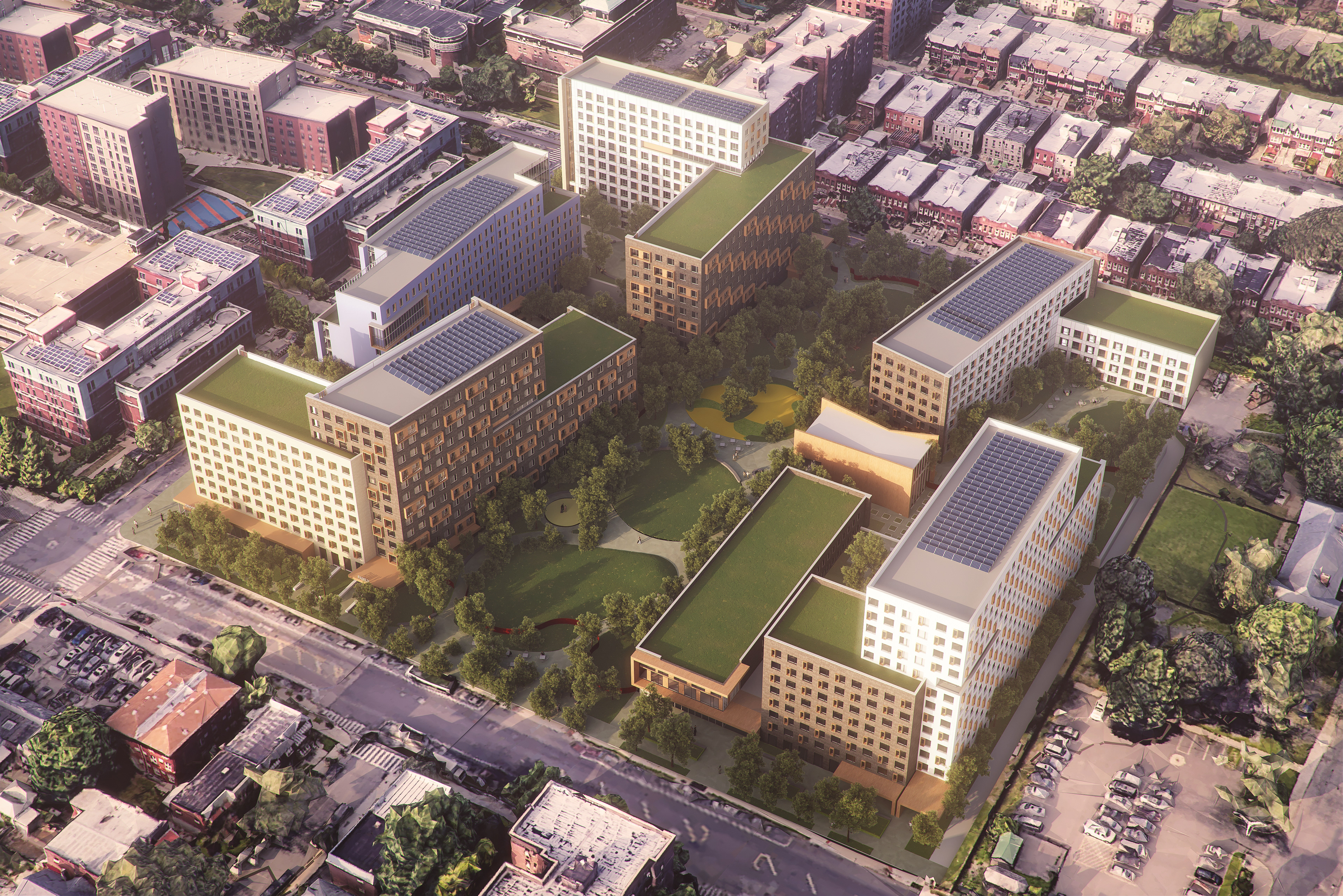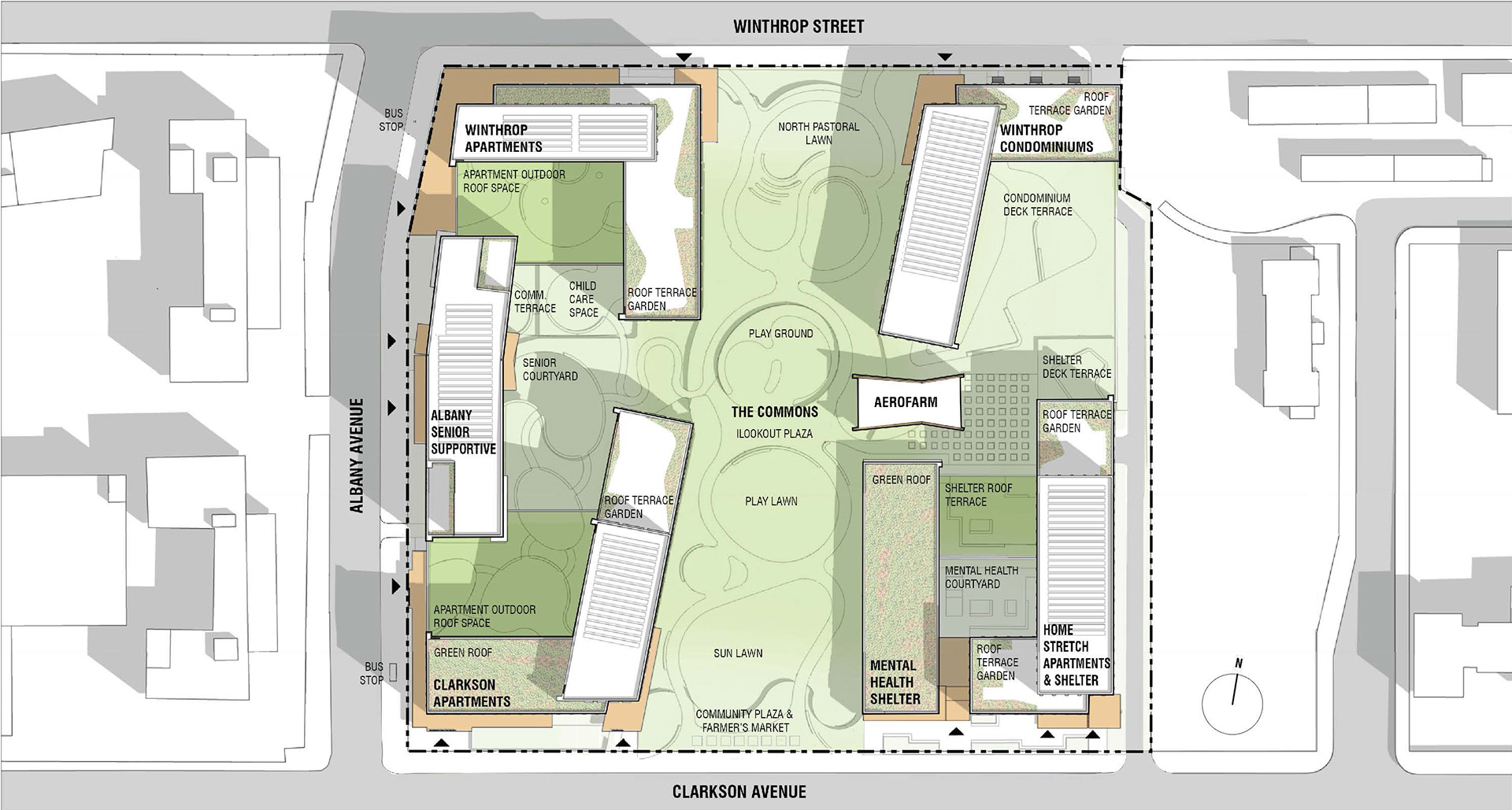 At almost 7 acres of land Kingsboro Common’s main design objective was to maximize all efforts for the surrounding community. This began with the initiative of giving as much outdoor space to the community as possible. The North / South axis, known as the Commons, took advantage of the existing hill-scape of the site and allowed for Clarkson busy street to open out onto an expansive green space. By carving out this space, the building masses created a language as to its interactions with private and public area. Facades that faced onto the public park and street carried a different materiality then those facing on the private courtyards.