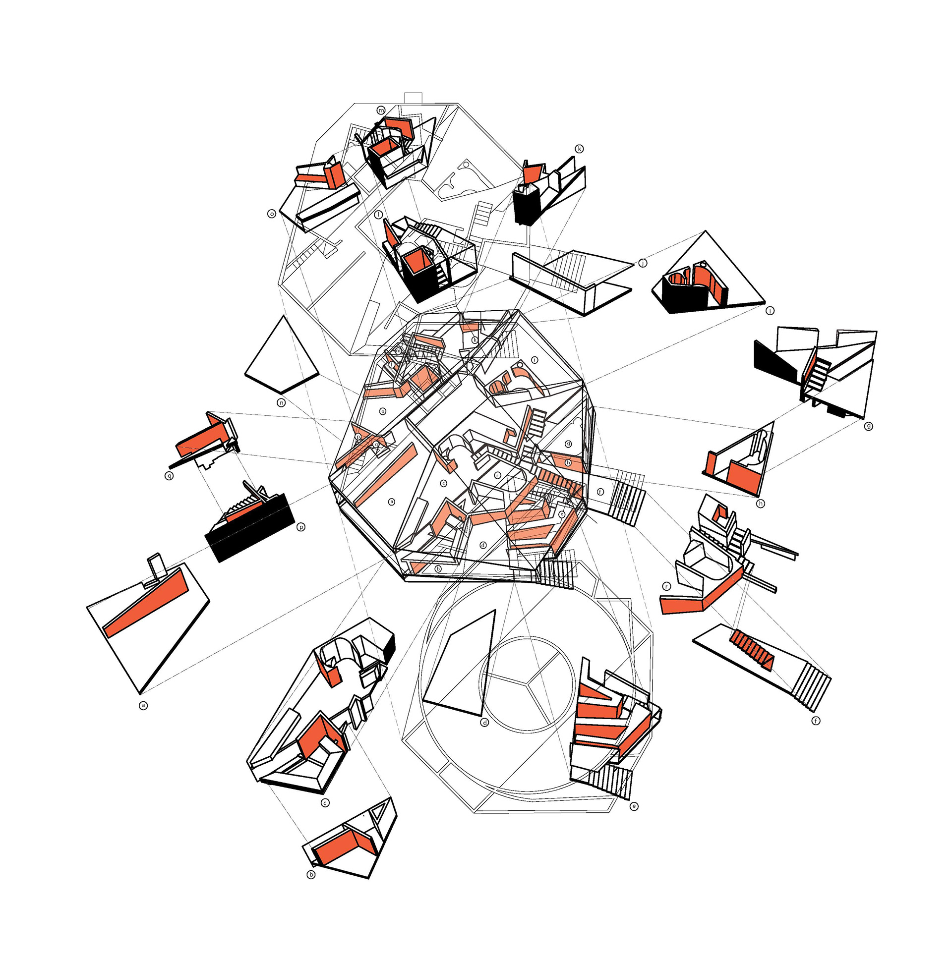 Representation drawings for Y2K House by OMA. Representational dissecting of the unbuilt residential project, pulling and inspecting each section of the household and recreating the house not as an envelope encasing program but as a skeleton holding onto muscle.